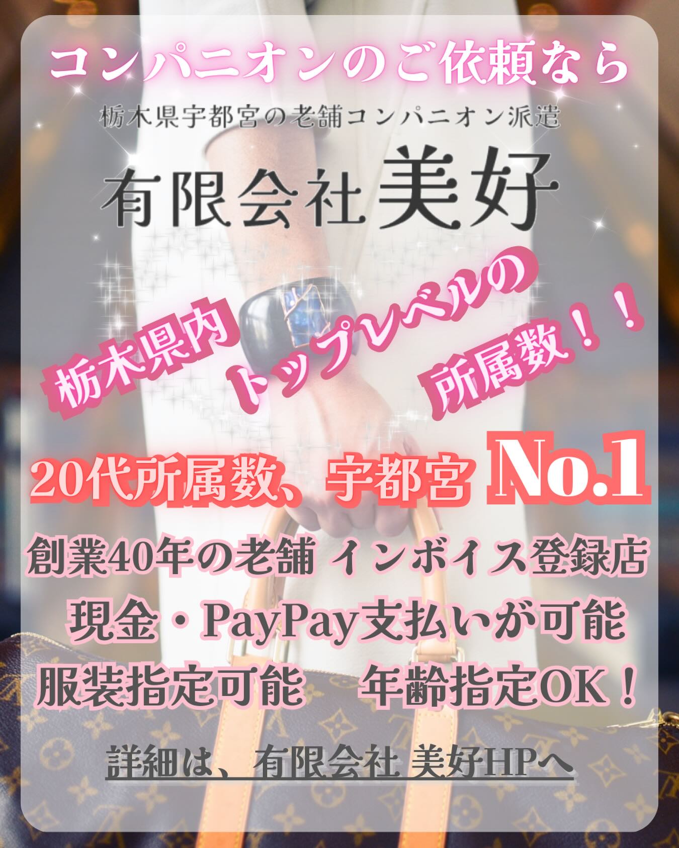 「宇都宮で楽しいひとときを過ごすなら、コンパニオン美好がお手伝いいたします。当社では20歳から30歳の素敵な女の子たちを派遣しております。宴会や飲み会など、様々なシーンで活躍してくれること間違いなし!お気軽にお問合せください。皆さまのご利用を心よりお待ちしております」