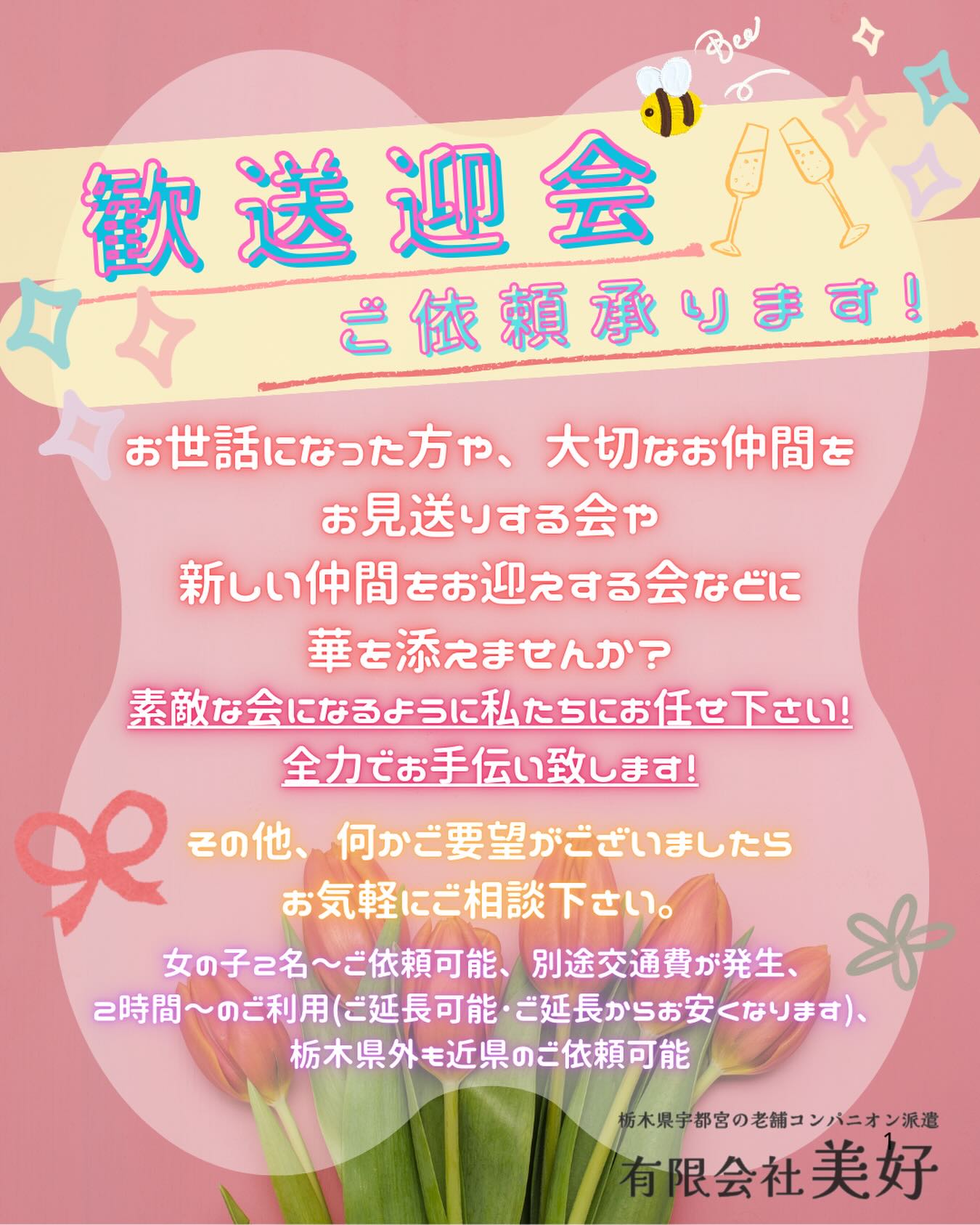 コンパニオン美好は、20歳から30歳の素敵な女の子たちを宇都宮市で派遣しています。宴会や飲み会などのイベントで、皆様のお供をさせていただきます。お気軽にお問合せください。心温まるひとときをお届けいたします。当社のコンパニオンと共に、楽しい時間を過ごしませんか。ご利用いただいたお客様からは、笑顔で見送られ、またお会いしたいとのお声をたくさんいただいております。是非、コンパニオン美好をご活用ください。